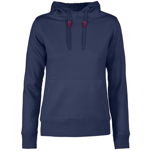 Oeko-Tex-sertifioitu. Naisten huppari, jossa puolikuuleikkaus niskassa, sekä 2×2-ribbineulos hihansuissa ja helmassa. Kontrastiväriset stopperit hupun kiristysnaruissa.