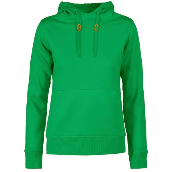 Oeko-Tex-sertifioitu. Naisten huppari, jossa puolikuuleikkaus niskassa, sekä 2×2-ribbineulos hihansuissa ja helmassa. Kontrastiväriset stopperit hupun kiristysnaruissa.